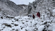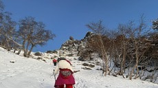 その後、段々急登が続き標高が上がるにしたがって登山道にも雪が積もり