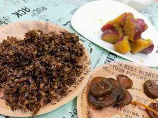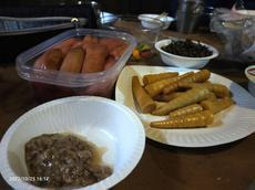 焼肉、うなぎ、手作り餃子が崩れてお好み焼きみたいなの!や、餅、たけ