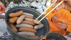 鍋で湯を沸かす横で、弘ちゃん手作りの餃子を焼く!