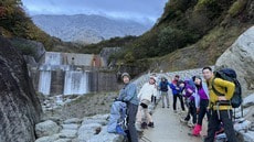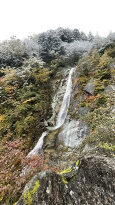 周りが紅葉と新雪の中、2段になった滝が落差40mぐらいあるだろうか